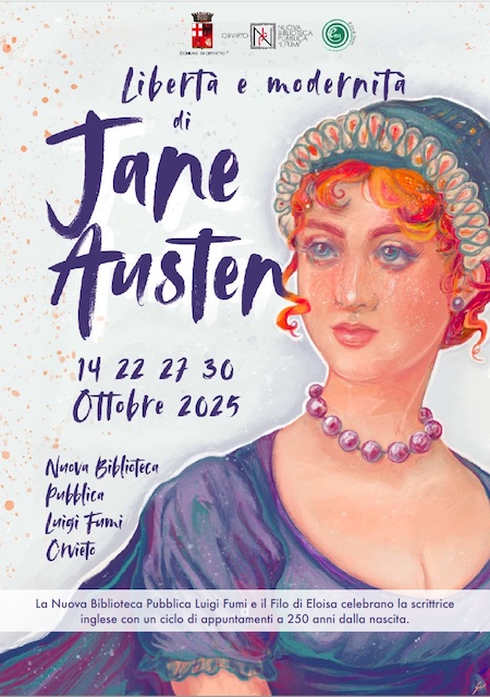 A 250 anni dalla nascita di Jane Austen, la Nuova Biblioteca Pubblica Luigi Fumi e l’associazione Il filo di Eloisa celebrano la grande e intramontabile scrittrice inglese con un ciclo di appuntamenti e una proposta didattica rivolta alle classi quarte e quinte del Liceo Scientifico “Ettore Majorana” e dell’IISACP (Istituto di istruzione superiore Artistica, Classica, Professionale) di Orvieto. Una collaborazione che trova il suo fondamento anche nella presenza, presso la Biblioteca cittadina, della “Sezione Eloisa Manciati, femminismi genere differenza”, che raccoglie opere di tante scrittrici e pensatrici delle letterature europee, tra cui la stessa J. A. L’iniziativa, che ha scelto come titolo generale Libertà e modernità di Jane Austen, si protrarrà per tutto il mese di ottobre e è volta non solo a fornire una chiave attuale per comprendere il successo ininterrotto di oltre due secoli di questo particolare classico, ma anche a interrogarsi su come viene recepita dalle nuove generazioni nella contemporaneità.