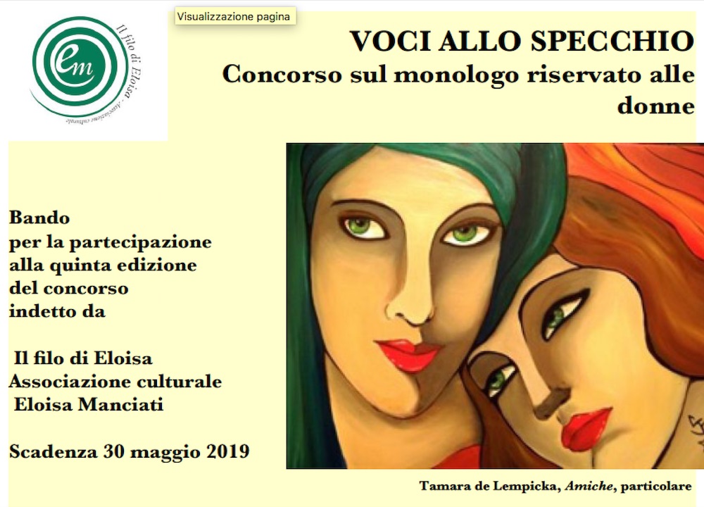 Per la quinta edizione del concorso indetto da “Il Filo di Eloisa. Associazione culturale Eloisa Manciati” proponiamo la creazione di un monologo* pronunciato da una personaggia della storia**, della letteratura o della contemporaneità. È quindi possibile prendere in considerazione sia una donna realmente esistita che immaginaria, sia una personaggia nota che una donna anonima del mondo di ieri o di oggi. In un monologo scritto ella porrà all’attenzione una propria verità, una propria versione dei fatti, una propria visione del mondo a partire dal suo vissuto, mettendo a fuoco una tematica per lei rilevante con sguardo di donna.